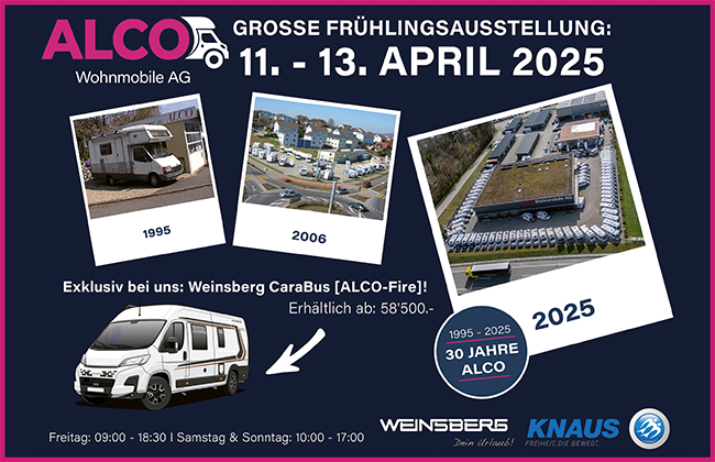 Fahrzeuge: 83 Fläche: 10'200m² Motivation: 100% 30 Jahre ALCO Als klassisches Familienunternehmen wurde die Alco Wohnmobile AG 1995 von der Familie Kiser gegründet und wird auch über 30 Jahre später noch immer mit viel Herzblut und Leidenschaft von dieser geführt. Mit einer höchst modernen Infrastruktur und einer Fläche von über 10`000m² sind wir der grösste Reisemobilhändler der Schweiz. Das 24–köpfige, top motivierte Team, kümmert sich sehr gerne um Sie, ihre Ideen und Ihr Reisemobil. Dabei steht für uns eine kompetente und seriöse Beratung stehts an erster Stelle. Seit 30 Jahren Handelspartner von Knaus & Weinsberg Reisemobile. Auszug aus unserem Fahrzeugbestand:/images/fz/w/1177/aussen/Weinsberg_CaraBus_630MEG_Outlaw_Fire_1.webp,/images/fz/w/1177/innen/Weinsberg_CaraBus_630MEG_Outlaw_Fire_Innen_1.webp,/images/fz/w/1177/innen/Weinsberg_CaraBus_630MEG_Outlaw_Fire_Innen_2.webp,/images/fz/w/1177/innen/Weinsberg_CaraBus_630MEG_Outlaw_Fire_Innen_3.webp,/images/fz/w/1177/innen/Weinsberg_CaraBus_630MEG_Outlaw_Fire_Innen_4.webp,/images/fz/w/1177/innen/Weinsberg_CaraBus_630MEG_Outlaw_Fire_Innen_5.webp,/images/fz/w/1177/innen/Weinsberg_CaraBus_630MEG_Outlaw_Fire_Innen_6.webp,/images/fz/w/1177/innen/Weinsberg_CaraBus_630MEG_Outlaw_Fire_Innen_7.webp,/images/fz/w/1177/innen/Weinsberg_CaraBus_630MEG_Outlaw_Fire_Innen_8.webp,/images/fz/w/1177/innen/Weinsberg_CaraBus_630MEG_Outlaw_Fire_Innen_9.webp,/images/fz/w/1177/innen/Weinsberg_CaraBus_630MEG_Outlaw_Fire_Innen_91.webp,/images/fz/w/1177/innen/Weinsberg_CaraBus_630MEG_Outlaw_Fire_Innen_92.webp,/images/fz/w/1177/innen/Weinsberg_CaraBus_630MEG_Outlaw_Fire_Innen_93.webp,/images/fz/w/1177/innen/Weinsberg_CaraBus_630MEG_Outlaw_Fire_Innen_94.webp,/images/fz/w/1177/innen/Weinsberg_CaraBus_630MEG_Outlaw_Fire_Innen_95.webp,/images/fz/w/1177/innen/Weinsberg_CaraBus_630MEG_Outlaw_Fire_Innen_96.webp,/images/fz/w/1177/innen/Weinsberg_CaraBus_630MEG_Outlaw_Fire_Innen_97.webp,/images/fz/w/1177/innen/Weinsberg_CaraBus_630MEG_Outlaw_Fire_Innen_98.webp,/images/fz/w/1177/innen/Weinsberg_CaraBus_630MEG_Outlaw_Fire_Innen_99.webp,/images/fz/w/1177/innen/Weinsberg_CaraBus_630MEG_Outlaw_Fire_Innen_991.webp,/images/fz/w/1177/innen/Weinsberg_CaraBus_630MEG_Outlaw_Fire_Innen_992.webp,/images/fz/w/1177/innen/Weinsberg_CaraBus_630MEG_Outlaw_Fire_Innen_993.webp,/images/fz/w/1177/innen/Weinsberg_CaraBus_630MEG_Outlaw_Fire_Innen_994.webp,/images/fz/w/1177/innen/Weinsberg_CaraBus_630MEG_Outlaw_Fire_Innen_995.webp Weinsberg CaraBus 630 MEG [Outlaw] [Fire] EditionFiat Ducato 2.2ltr. 180 PSGetriebe: AutomatischModelljahr: 2025Preis ausgestelltes Modell Euro 95'566.–Sondermodell Rabatt Euro -10'767.–Jubiläumsangebot CHF 78'900.–/images/fz/w/1178/aussen/Weinsberg_CaraCompact_640MEG_Suite_Mercedes_1.webp,/images/fz/w/1178/innen/Weinsberg_CaraCompact_640MEG_Suite_Mercedes_Innen_1.webp,/images/fz/w/1178/innen/Weinsberg_CaraCompact_640MEG_Suite_Mercedes_Innen_2.webp,/images/fz/w/1178/innen/Weinsberg_CaraCompact_640MEG_Suite_Mercedes_Innen_3.webp,/images/fz/w/1178/innen/Weinsberg_CaraCompact_640MEG_Suite_Mercedes_Innen_4.webp,/images/fz/w/1178/innen/Weinsberg_CaraCompact_640MEG_Suite_Mercedes_Innen_5.webp,/images/fz/w/1178/innen/Weinsberg_CaraCompact_640MEG_Suite_Mercedes_Innen_6.webp,/images/fz/w/1178/innen/Weinsberg_CaraCompact_640MEG_Suite_Mercedes_Innen_7.webp,/images/fz/w/1178/innen/Weinsberg_CaraCompact_640MEG_Suite_Mercedes_Innen_8.webp,/images/fz/w/1178/innen/Weinsberg_CaraCompact_640MEG_Suite_Mercedes_Innen_9.webp,/images/fz/w/1178/innen/Weinsberg_CaraCompact_640MEG_Suite_Mercedes_Innen_91.webp,/images/fz/w/1178/innen/Weinsberg_CaraCompact_640MEG_Suite_Mercedes_Innen_92.webp,/images/fz/w/1178/innen/Weinsberg_CaraCompact_640MEG_Suite_Mercedes_Innen_93.webp,/images/fz/w/1178/innen/Weinsberg_CaraCompact_640MEG_Suite_Mercedes_Innen_94.webp,/images/fz/w/1178/innen/Weinsberg_CaraCompact_640MEG_Suite_Mercedes_Innen_95.webp,/images/fz/w/1178/innen/Weinsberg_CaraCompact_640MEG_Suite_Mercedes_Innen_96.webp,/images/fz/w/1178/innen/Weinsberg_CaraCompact_640MEG_Suite_Mercedes_Innen_97.webp,/images/fz/w/1178/innen/Weinsberg_CaraCompact_640MEG_Suite_Mercedes_Innen_98.webp,/images/fz/w/1178/innen/Weinsberg_CaraCompact_640MEG_Suite_Mercedes_Innen_99.webp,/images/fz/w/1178/innen/Weinsberg_CaraCompact_640MEG_Suite_Mercedes_Innen_991.webp,/images/fz/w/1178/innen/Weinsberg_CaraCompact_640MEG_Suite_Mercedes_Innen_992.webp,/images/fz/w/1178/innen/Weinsberg_CaraCompact_640MEG_Suite_Mercedes_Innen_993.webp,/images/fz/w/1178/innen/Weinsberg_CaraCompact_640MEG_Suite_Mercedes_Innen_994.webp,/images/fz/w/1178/innen/Weinsberg_CaraCompact_640MEG_Suite_Mercedes_Innen_995.webp Weinsberg CaraCompact 640 MEG Suite EditionMercedes Sprinter 2.0ltr / 170 PSGetriebe: AutomatischModelljahr: 2025Mietwagen Nr: 541. Inverkehrssetzung: Noch nicht zugelassenGefahrene Km: 20 - 25'000 kmPreis ausgestelltes Modell Euro 123'244.–Verkaufspreis (Eurokurs heute 0.96) CHF 80'800.–/images/fz/w/1192/aussen/Knaus_Van_TI_640_MEG_Vansation_VW_1.webp,/images/fz/w/1192/innen/Knaus_Van_TI_640_MEG_Vansation_VW_Innen_1.webp,/images/fz/w/1192/innen/Knaus_Van_TI_640_MEG_Vansation_VW_Innen_2.webp,/images/fz/w/1192/innen/Knaus_Van_TI_640_MEG_Vansation_VW_Innen_3.webp,/images/fz/w/1192/innen/Knaus_Van_TI_640_MEG_Vansation_VW_Innen_4.webp,/images/fz/w/1192/innen/Knaus_Van_TI_640_MEG_Vansation_VW_Innen_5.webp,/images/fz/w/1192/innen/Knaus_Van_TI_640_MEG_Vansation_VW_Innen_6.webp,/images/fz/w/1192/innen/Knaus_Van_TI_640_MEG_Vansation_VW_Innen_7.webp,/images/fz/w/1192/innen/Knaus_Van_TI_640_MEG_Vansation_VW_Innen_8.webp,/images/fz/w/1192/innen/Knaus_Van_TI_640_MEG_Vansation_VW_Innen_9.webp,/images/fz/w/1192/innen/Knaus_Van_TI_640_MEG_Vansation_VW_Innen_91.webp,/images/fz/w/1192/innen/Knaus_Van_TI_640_MEG_Vansation_VW_Innen_92.webp,/images/fz/w/1192/innen/Knaus_Van_TI_640_MEG_Vansation_VW_Innen_93.webp,/images/fz/w/1192/innen/Knaus_Van_TI_640_MEG_Vansation_VW_Innen_94.webp,/images/fz/w/1192/innen/Knaus_Van_TI_640_MEG_Vansati